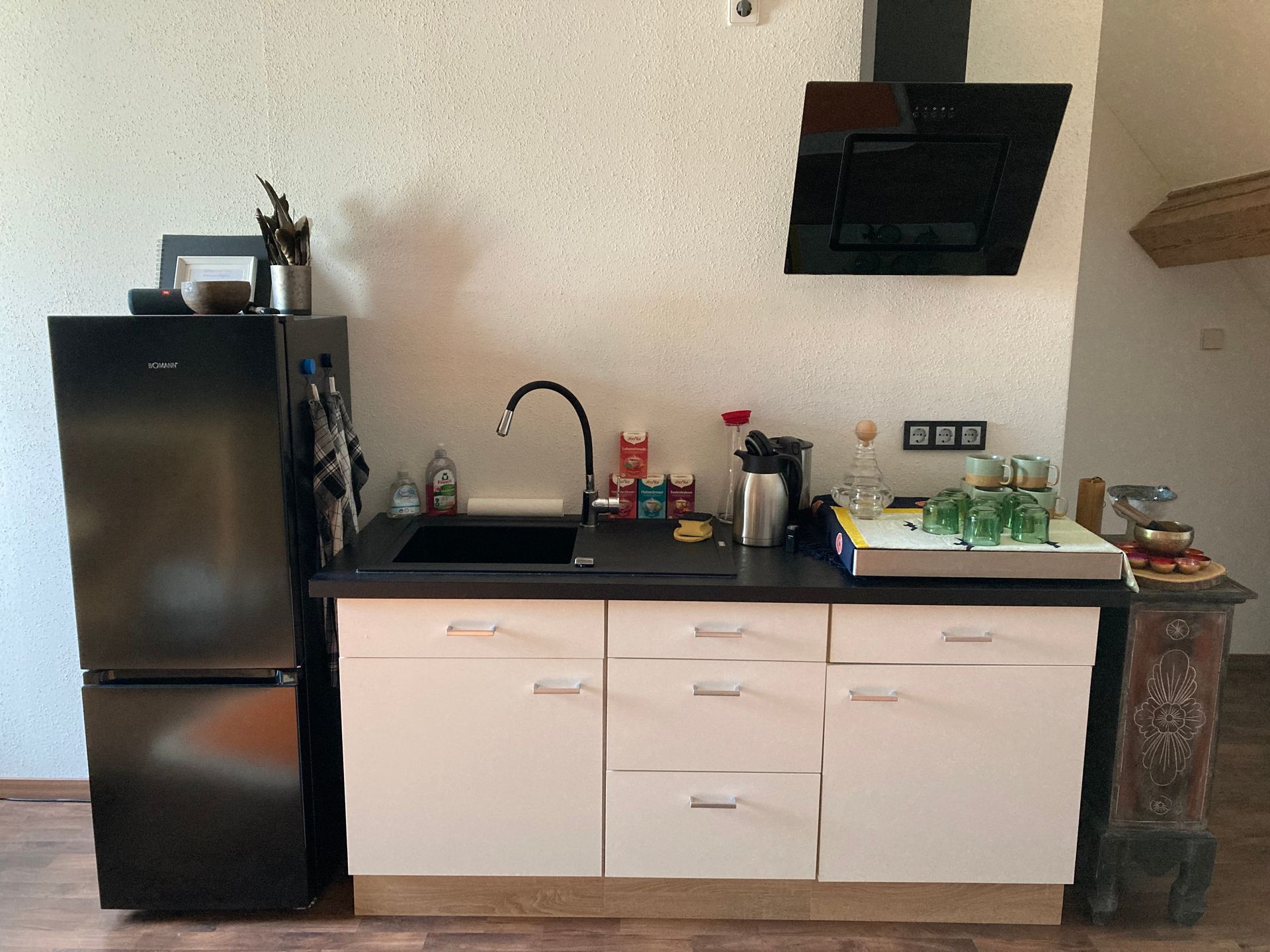 Im Seminarraum selber gibt es ein Hochbett für zwei Personen und ein Schlafsofa für zwei Personen. In den beiden Gästezimmern im 1. OG gibt es jeweils Einzelbett (90x200 cm) und ein Doppelzimmer mit Doppelbett (180x200 cm). Die Ferienwohnung kann ebenfalls für max. 2 Personen (Doppelbett 180x200 cm) dazu gebucht werden. Es können also insgesamt 9 Personen hier bei uns im Haus übernachten. Weitere Übernachtungsmöglichkeiten für Deine Teilnehmer können wir vermitteln. In Laufnähe (3 Min.) empfehlen wir das Haus Camino mit vier Ferienwohnungen oder direkt gegenüber der Schwarzbuure Hof mit drei wunderschön renovierten Gästezimmern. Achtung, in unserem Haus gibt es keine Verpflegungsmöglichkeit. Wir können jedoch ein paar sehr nahe liegende Gasthöfe empfehlen. Es gibt auch die Möglichkeit der Selbstverpflegung. Im Seminarraum und in der Ferienwohnung gibt es jeweils eine Küche bzw. Küchenzeile (im Seminarraum).